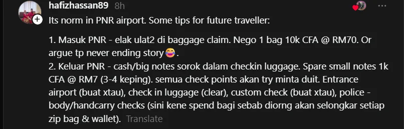 Beberapa individu berkongsi pengalaman dan tip perjalanan, antaranya membawa wang dalam nilai kecil, menyimpan wang di tempat berasingan serta bersedia berhadapan dengan banyak pemeriksaan di lapangan terbang.