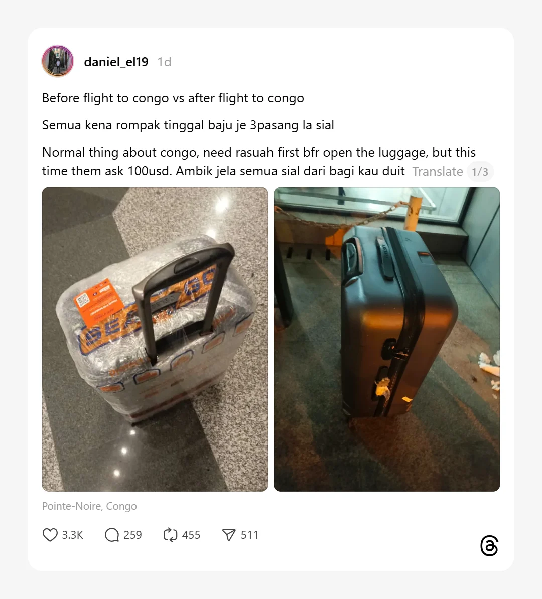 Satu perkongsian di media sosial baru-baru ini mencetuskan perbualan hangat apabila perkongsian itu memaparkan keadaan bagasi seorang individu sebelum dan selepas penerbangan ke sebuah negara di Afrika Tengah.