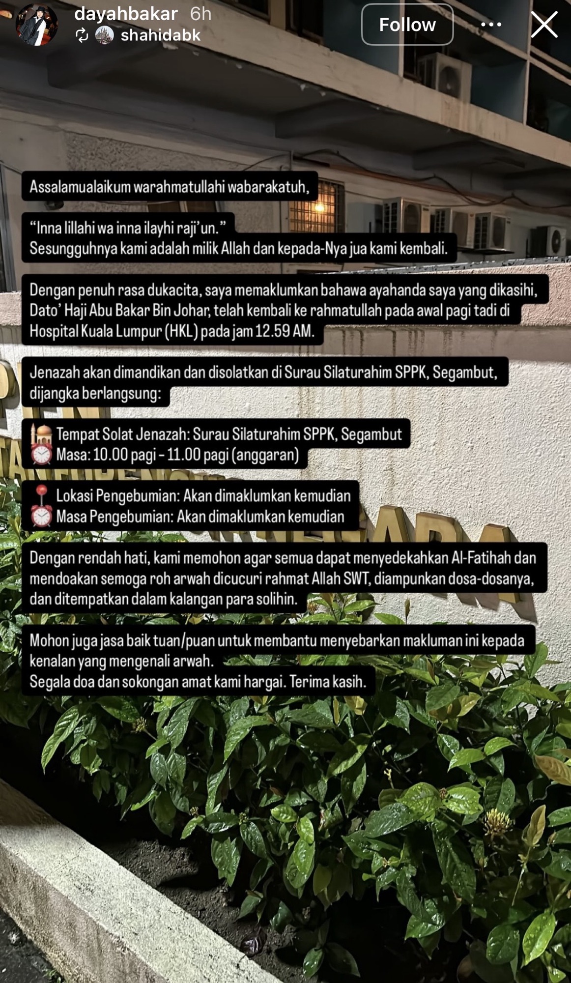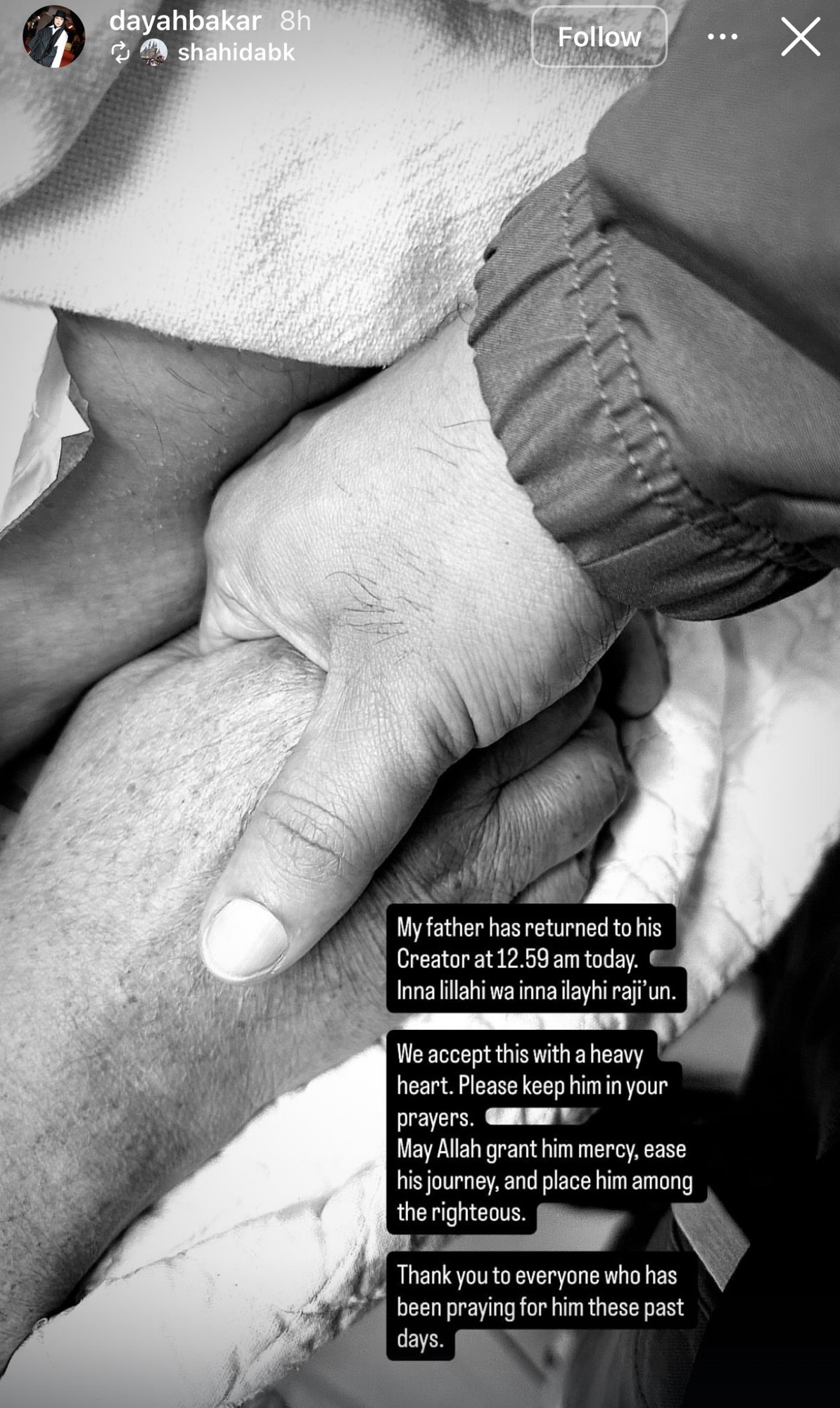 Dayah atau Nur Hidayah Datuk Haji Bakar menerusi hantaran yang telah ‘di-repost’ di Insta Stories, menyatakan bahawa mereka menerima pemergian bapanya itu dengan hati yang berat, selain memohon doa orang buat Allahyarham bapanya itu.