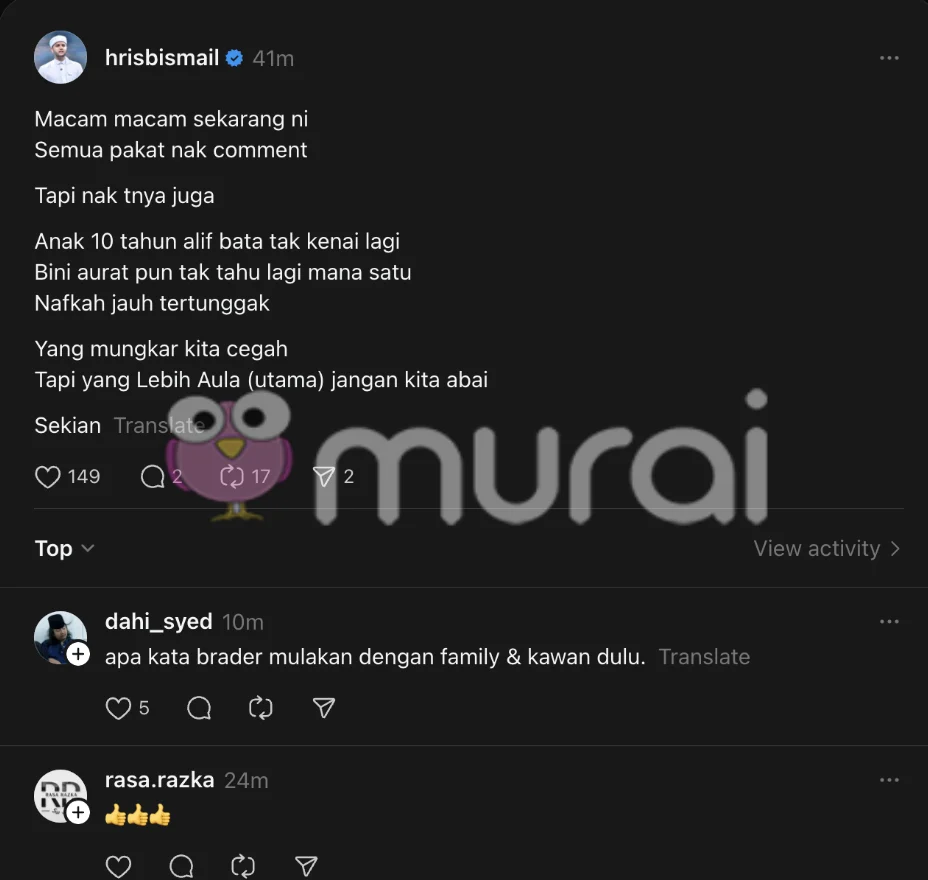 Haris mengingatkan, menegur itu betul. Tapi prioriti kena tepat. Asas rumah tangga dan agama dalam keluarga sendiri adalah kewajipan paling utama sebelum kita sibuk membetulkan orang lain. MURAI pun setuju, banyak yang nak jadi “penasihat” di internet, tapi lupa peranan sebagai ibu bapa, pasangan atau ketua keluarga.