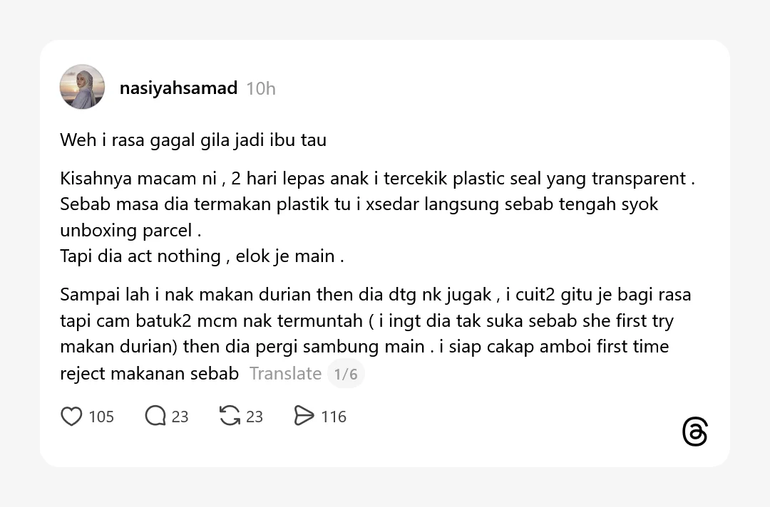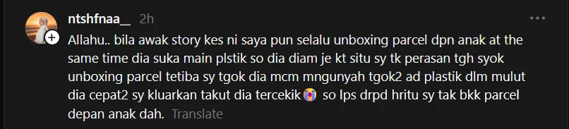 Meninjau ke ruangan komen, rata-rata netizen tampil berkongsi pengalaman yang hampir serupa. Ada yang mendedahkan anak mereka pernah memasukkan plastik ke dalam mulut ketika ibu bapa sedang leka membuka bungkusan.