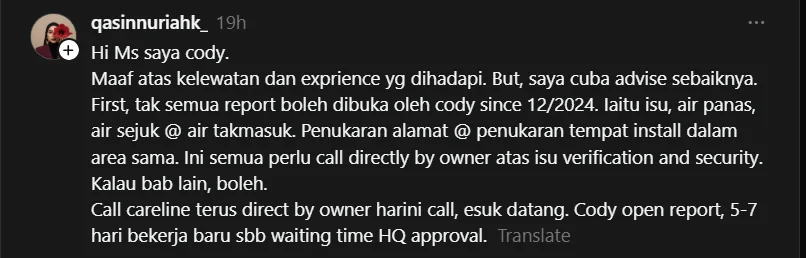 Dalam masa yang sama, seorang individu yang memperkenalkan diri sebagai cody tampil memberi penjelasan. Menurutnya, bermula Disember 2024, terdapat beberapa isu tertentu seperti masalah air panas, air sejuk dan air tidak keluar yang perlu dilaporkan terus oleh pemilik kepada pusat khidmat pelanggan atas faktor pengesahan dan keselamatan.