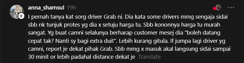 Ada yang berkongsi pengalaman berbual dengan pemandu sebelum ini, yang mengatakan bahawa segelintir pemandu sengaja melambatkan perjalanan sebagai tanda tidak bersetuju dengan kadar tambang yang dianggap terlalu rendah.