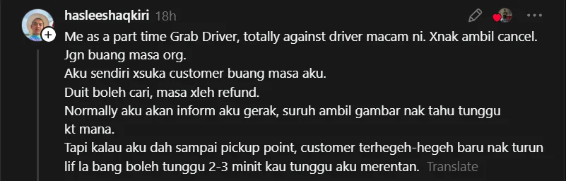 Dalam ruangan komen, seorang individu yang mengaku sebagai pemandu Grab sambilan turut memberikan pandangannya.