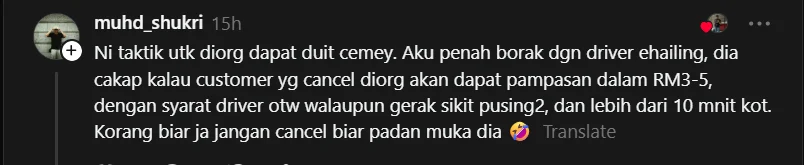 Jika penumpang tidak sabar dan memilih untuk membatalkan tempahan, ada juga dakwaan bahawa pemandu mungkin menerima pampasan kecil sekitar RM3 hingga RM5, bergantung kepada syarat tertentu dalam sistem aplikasi.