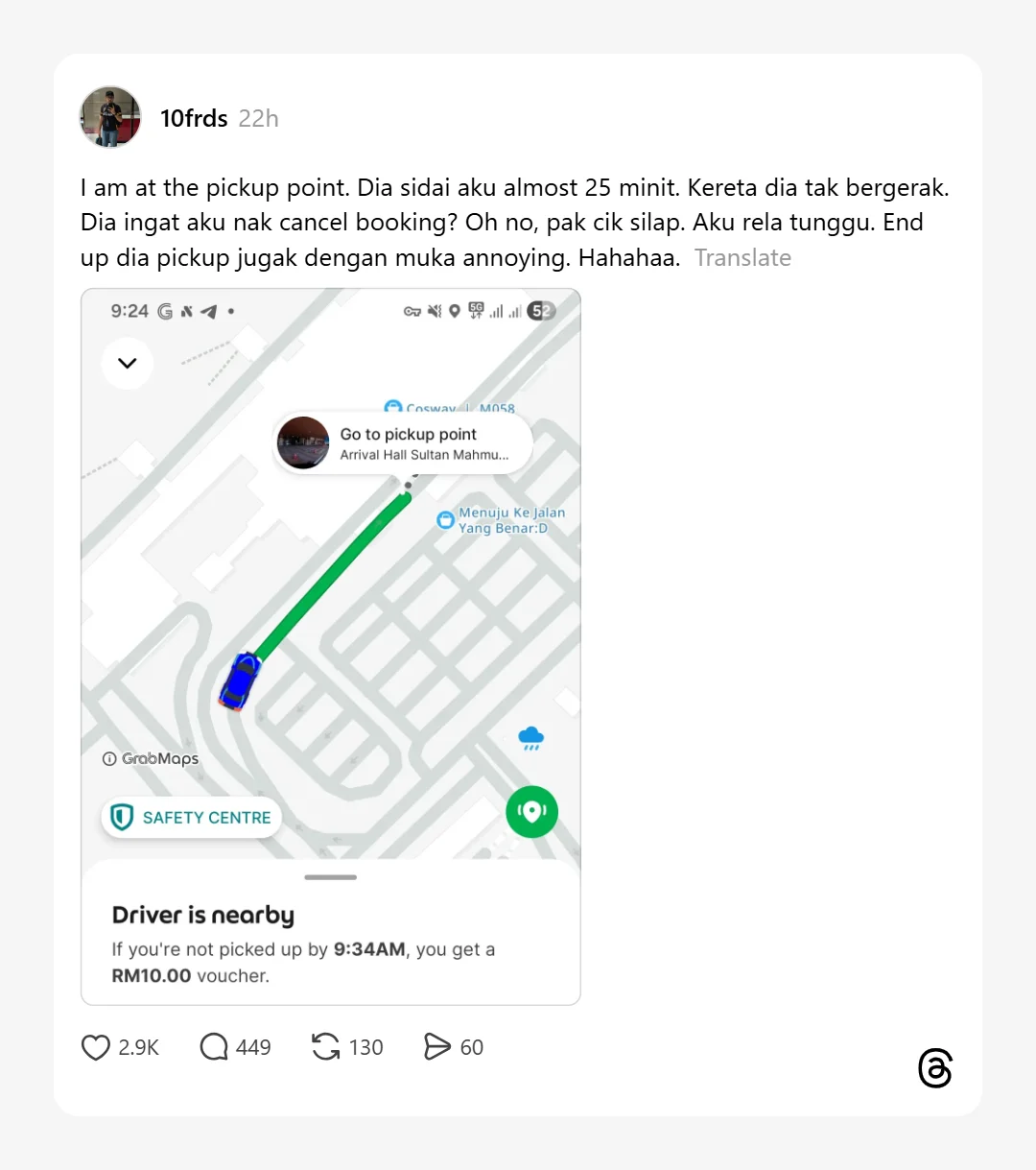 Dalam perkongsian di Thread tersebut, penumpang itu mendakwa pemandu berkenaan mungkin menyangka dia akan membatalkan tempahan selepas menunggu lama.