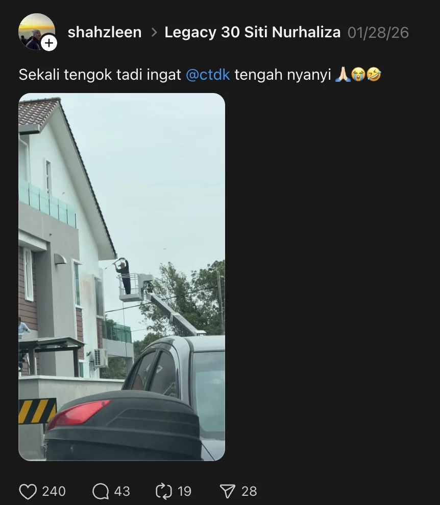 Baru-baru ini, seorang peminat berkongsi satu posting melucukan apabila terlihat seorang pekerja menaiki kren tinggi untuk mengecat rumah. Entah macam mana, dalam sekelip mata, visual itu terus mengingatkan peminat tersebut kepada pembukaan ikonik Konsert Legacy30, di mana TokTi pernah membuat persembahan di atas kren.