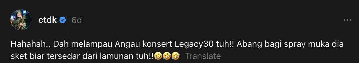 “Hahahah.. Dah melampau angau konsert Legacy30 tuh!! Abang bagi spray muka dia sket biar tersedar dari lamunan tuh!!”
